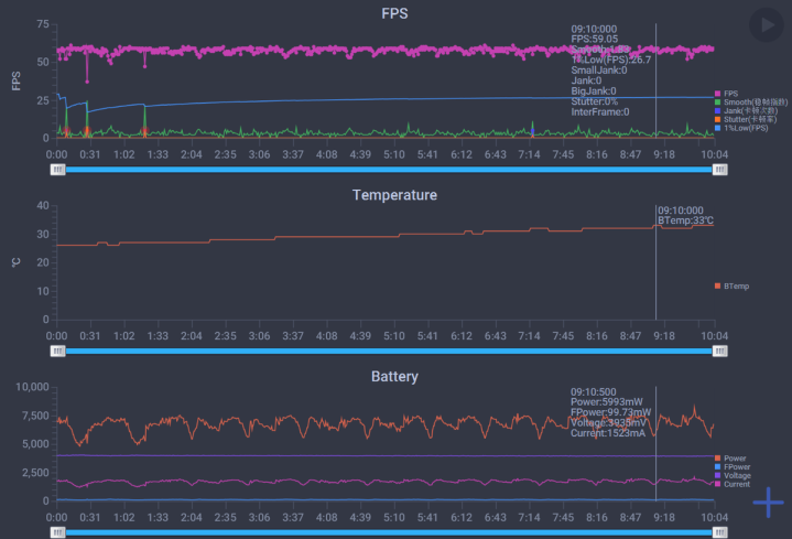 在更高负载的《崩坏:星穹铁道》实测中,我们选择匹诺康尼地图进行长时间跑图,此次测试的渲染分辨率为954P,而传统1.5K屏幕的游戏原始渲染分辨率通常仅为720P或763P,在更高分辨率的压力下,天玑9500仍交出了平均帧率接近58fps、功耗仅 6.7W的亮眼数据。