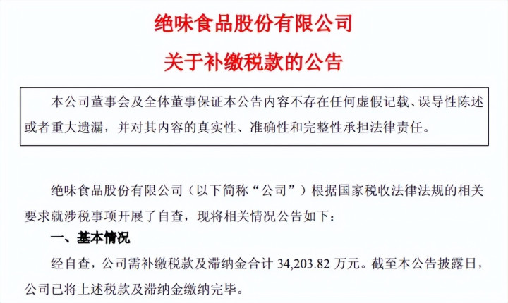 补缴税款3.42亿元。4月4日,绝味食品披露的补缴税款公告显示,公司根据国家税收法律法规的相关要求就涉税事项开展了自查,需补缴税款及滞纳金合计34,203.82万元。截至公告披露日,公司已将上述税款及滞纳金缴纳完毕。