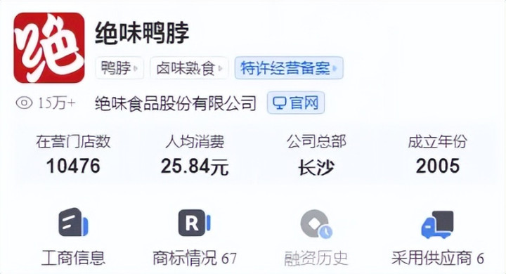 根据第三方平台窄门餐眼,截至4月7日,绝味鸭脖在营门店仅10476家,与巅峰时期近1.6万家早已不可同日而语,这是业绩下滑的主要因素,深究根源来看,伴随着消费环境的不景气,餐饮行业面临着洗牌,作为餐饮行业一份子的绝味鸭脖加盟店不可避免的受到冲击,导致相关门店大幅减少。
