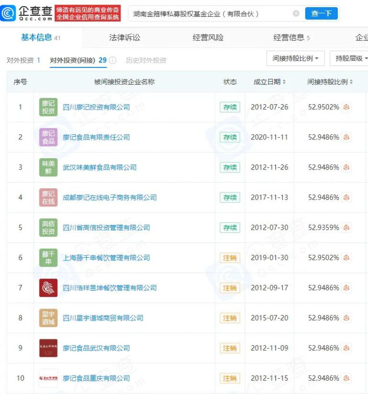 投资廖记棒棒鸡遇挫。据2024年报,湖南金箍棒私募股权基金企业(有限合伙)期初余额为4.36亿元,权益法确认下投资损失1.66亿元,期末余额2.7亿元,企查查显示该基金投资对象主要是廖记食品(廖记棒棒鸡),间接投资的29家企业中仅5家企业存续,其余其余均已注销。