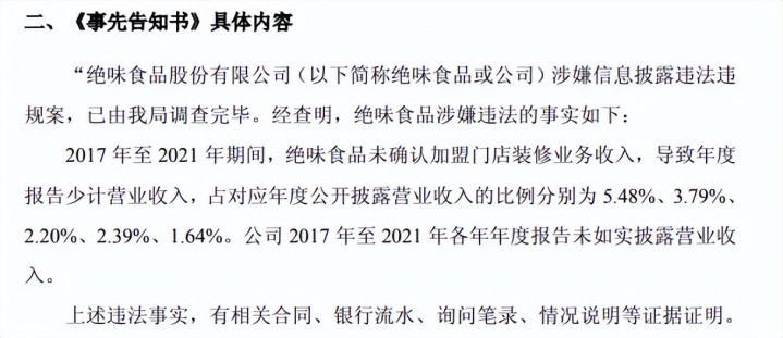 《行政处罚决定书》显示,2017年至2021年期间,绝味食品未确认加盟门店装修业务收入,导致年度报告少计营业收入,占对应年度公开披露营业收入的比例分别为5.48%、3.79%、2.20%、2.39%、1.64%。公司2017年至2021年各年年度报告未如实披露营业收入。
